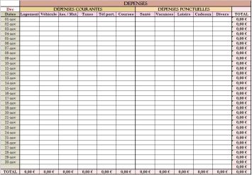 J’ai tout d’abord un grand tableau des dépenses pour le mois en cours avec une ligne destinée à chaque jour (colonne de gauche). Deux sous-colonnes avec les dépenses courantes d’un côté, comme tout ce qui concerne le logement, la voiture, les assurances / mutuelles, les taxes, les abonnements divers et les courses ; et les dépenses ponctuelles de l’autre concernant la santé, les vacances et loisirs, les cadeaux et autres. Je rentre les montants au fur et à mesure dans les cases correspondantes et grâce aux formules que j’ai préalablement entré dans les diverses cases « total », les calculs se font automatiquement.