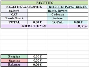 Ensuite, j’ai fait un petit tableau des recettes, courantes et ponctuelles pour le mois en cours très simplifiées avec toujours le total pour chaque colonne. J’ai en dessous fait un tableau résumé des dépenses, recettes et balance pour véritablement comparer les entrées et sorties de manière bien plus précise. Les couleurs sont là pour m’aider à bien visualiser la situation